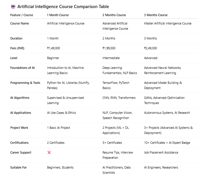 Our AI course is designed to equip you with in-demand artificial intelligence skills. You’ll learn the fundamentals of AI, machine learning, and deep learning while working on real-world projects. The course covers key concepts like neural networks, natural language processing (NLP), computer vision, and AI-driven automation.With hands-on training, you’ll develop AI models, train algorithms, and implement data-driven solutions. Whether you’re a beginner or an experienced professional, this course will help you master AI technologies used in industries like healthcare, finance, and automation.By the end of the course, you’ll have the expertise to build AI-powered applications and advance your career in AI development, data science, or machine learning engineering. Get certified and boost your career today!