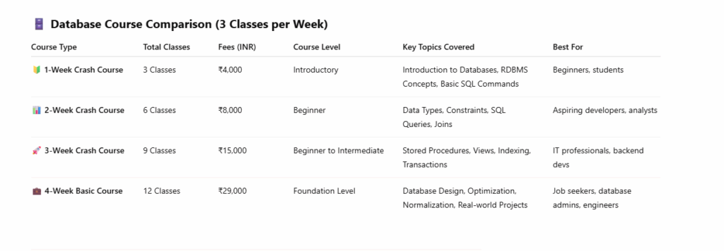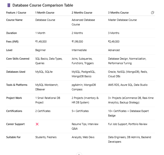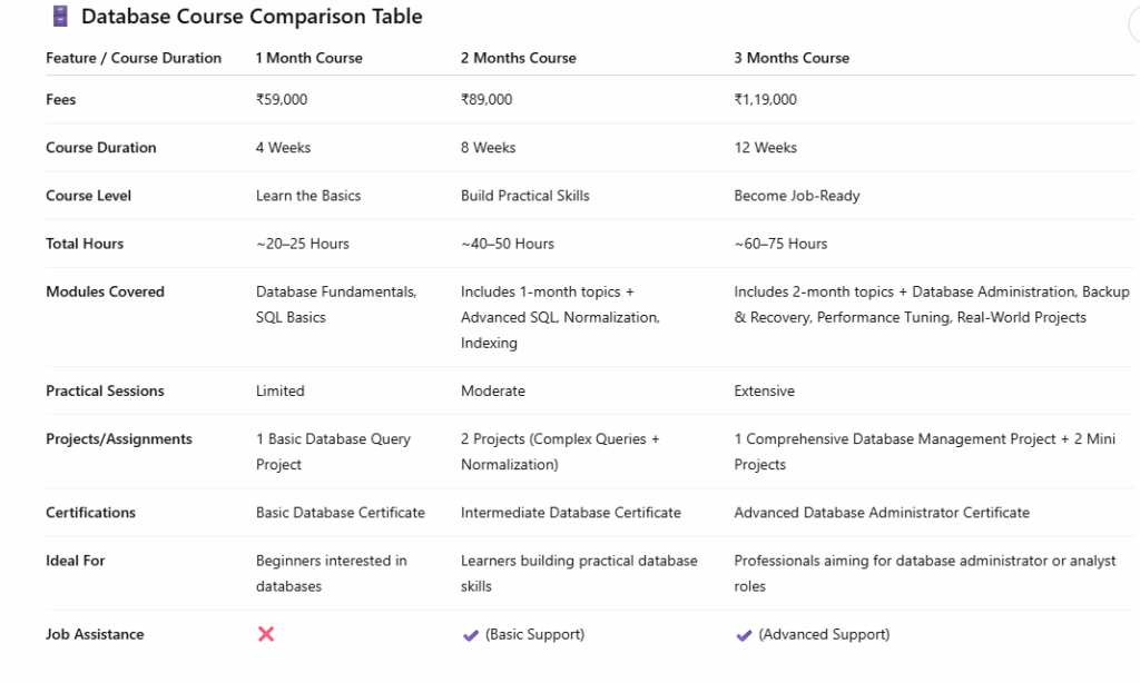 Joining our Database Course is the perfect choice for anyone looking to enhance their skills in data management and analysis. In today’s data-driven world, proficiency in database technology is crucial for career advancement. Our course offers comprehensive training on essential topics like SQL, data modeling, and database design, ensuring you develop a strong foundation in database concepts.