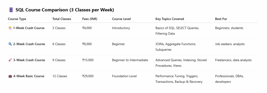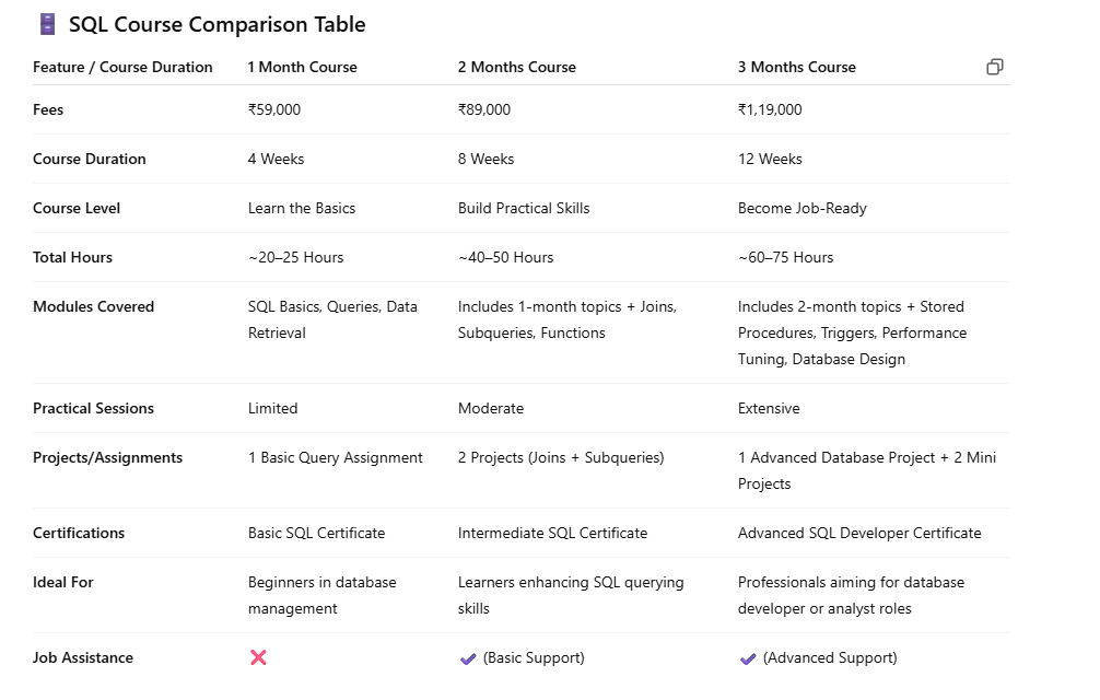 By choosing our SQL Course, you are investing in your future. You’ll build a solid understanding of SQL that empowers you to analyze data effectively, generate meaningful insights, and drive business success. Join us today and take the first step toward becoming a confident SQL professional ready to tackle the challenges of the data-driven world!